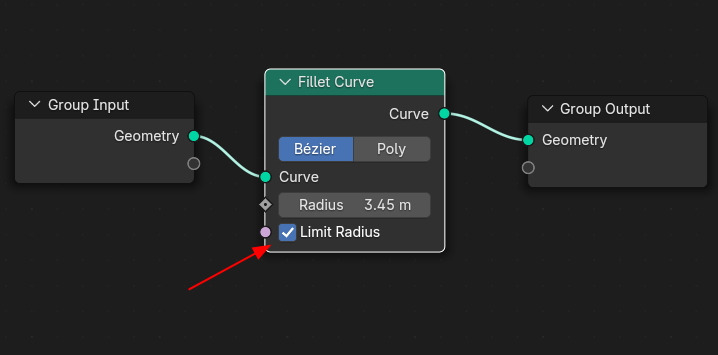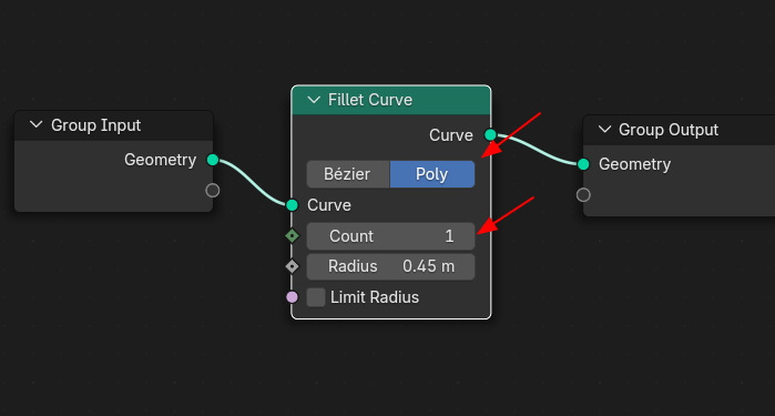 여기에 Fillet Curve노드를 연결하고, 기본타입 Bezier 에, Radius 0.25m 입니다.