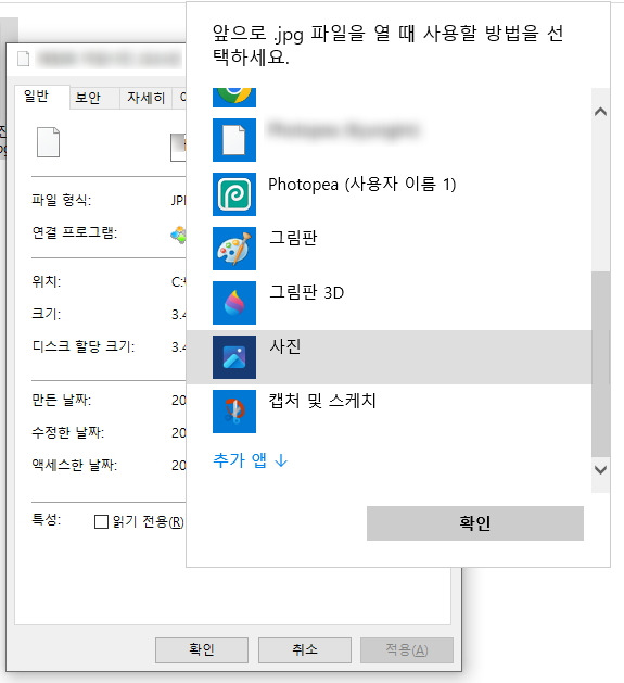 또는 파일의 속성에 들어가서, '변경' 버튼을 클릭하면 '이미지 파일'을 수정할수 있는 프로그램들의 목록을 볼수 있습니다. 그 중, '사진'을 선택합니다.