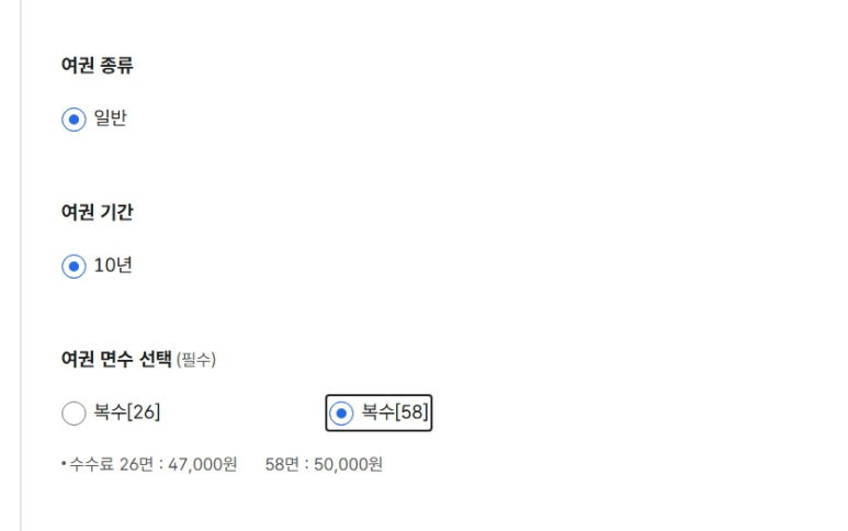 여권의 종류, 기간, 확인하고, 여권의 면수는 26페이지와 58페이지가 있는데, 58을 선택했습니다. 3000원 밖에 차이가 안나서요. ^^