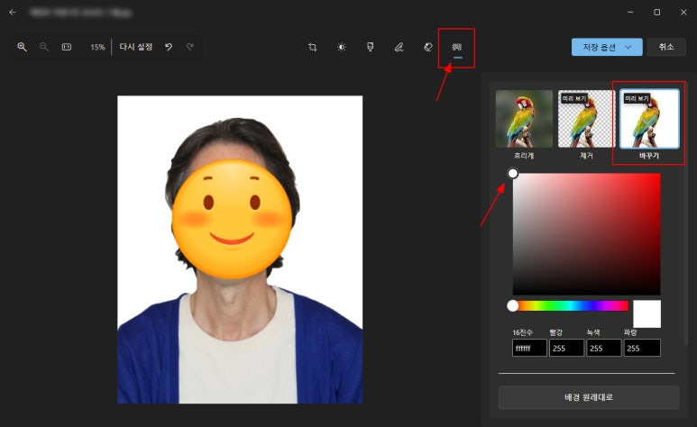 여권사진의 조건중에 배경은 반드시 흰색, White로 해야 합니다. 그래서 Color를 선택하고, '채우기' 버튼을 클릭해서 배경을 흰색으로 해줍니다.