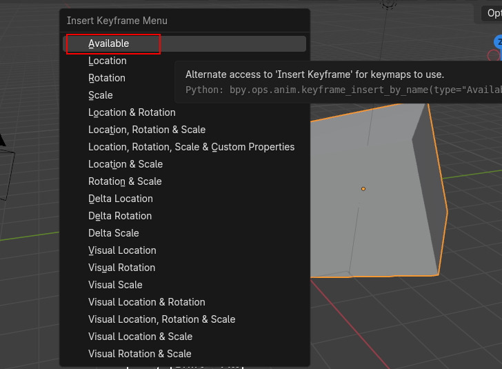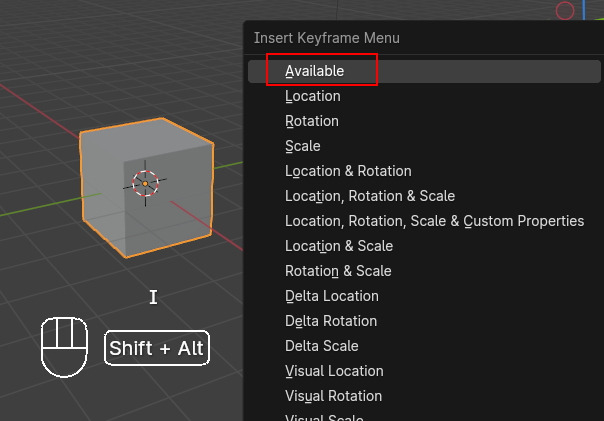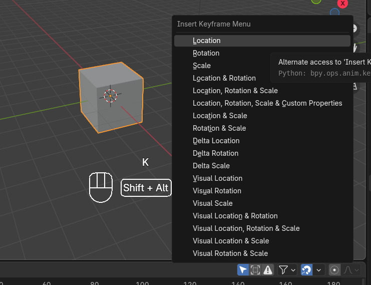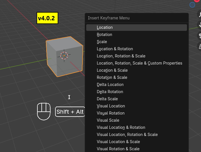 이렇게 Insert Keyfame Menu가 나타나는 데, 4.1 부터는 단축키 'I' 는