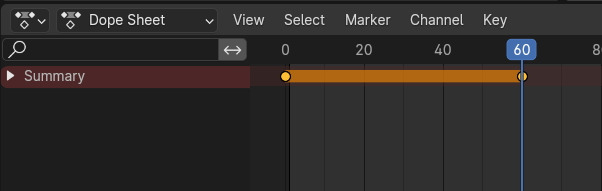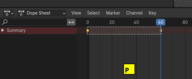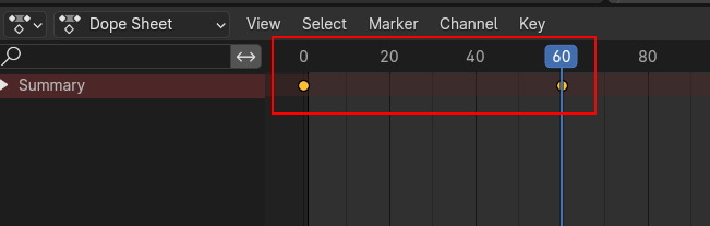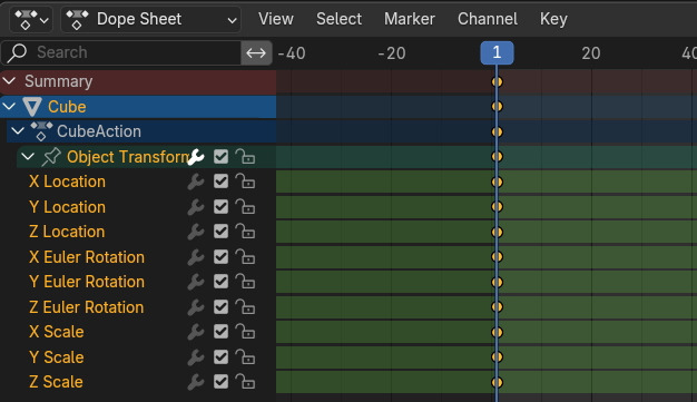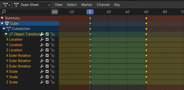 Dope Sheet 의 Summary를 클릭해서 열어보면, Object Transform에 Location, Rotation, Scale의 X,Y, Z의 채널이 보입니다. 현재 frame에 Keyframe 의 노란 마크가 보입니다.