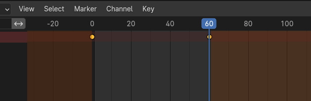 60 frame으로 이동한 후, Insert Keyframe을 합니다. 그러면, 현재 Keyframe을 가지고 있을 때에 보이는 Available(어베일러벌), Key가 설정되어 있는 채널에 모두 Key가 들어 갑니다.
