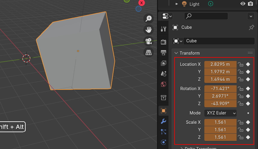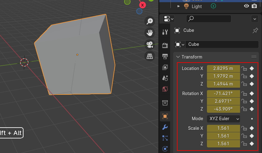 Properties 의 Transform 에 Location, Rotation, Scale에 X,Y, Z 축이 황색과 다이아몬드 마크로 Keyframe이 표시가 됩니다.
