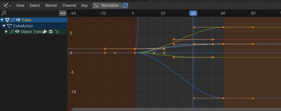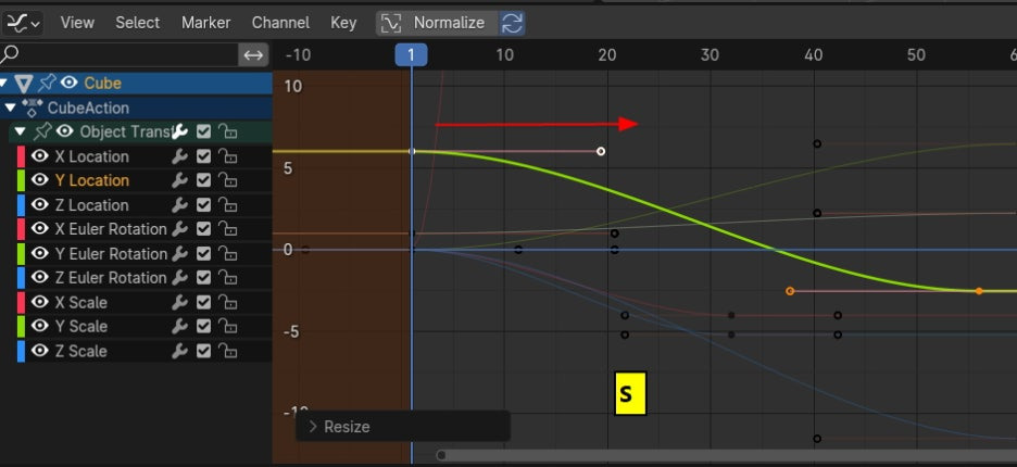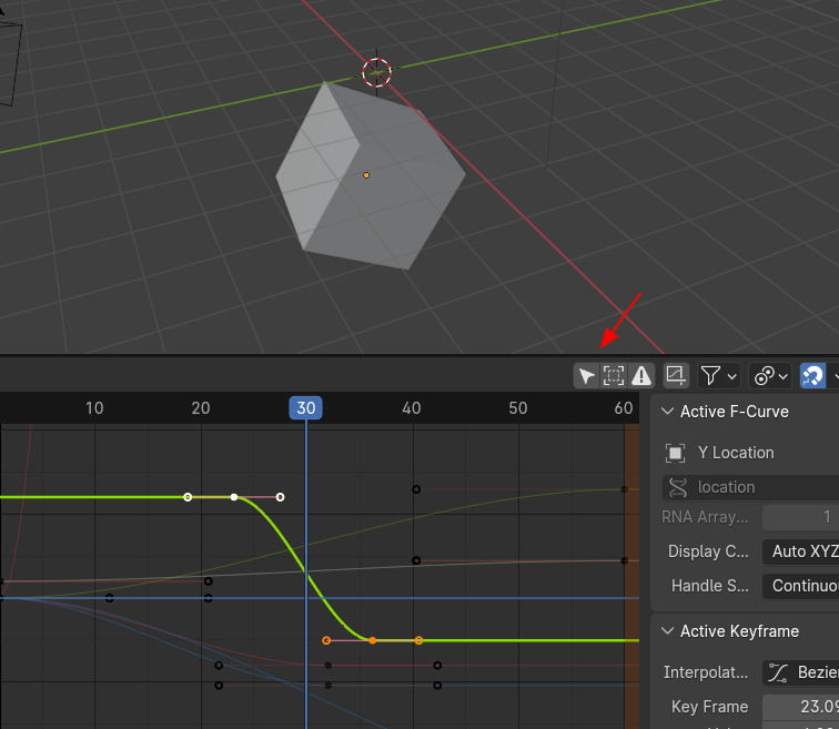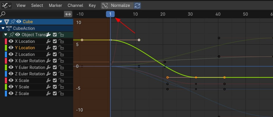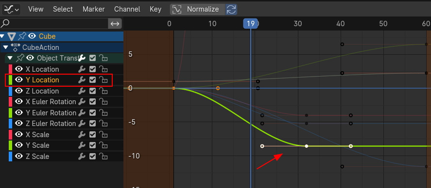 다시 Y Location을 더블 클릭, 선택하면, 오른쪽의 Graph Editor의 Curve의 Keyframe이 모두 선택이 됩니다.