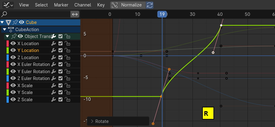 R키는 선택해서 드래그 하면 선택된 Keyfame들은 회전할 수 있습니다.