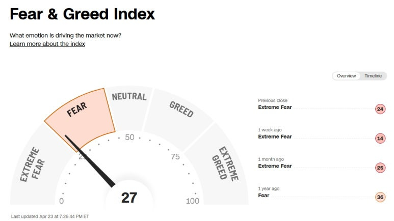 미국 증시 공포 탐욕 지수 (Greed and Fear Index): 27