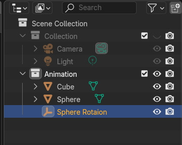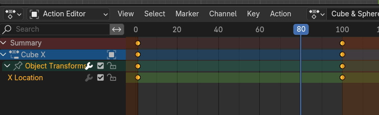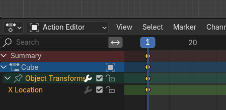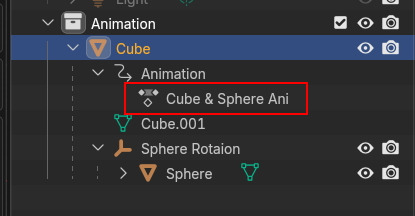 Outliner의 Cube를 열어보면, Animation 아래에 Action이 보입니다.