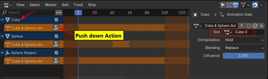 Cube 의 아래에 Action이 보이고, 그 옆에 버튼이 Push down Action 입니다. 오른쪽 Side bar에 Action목록과 Slot이 보입니다. Cube X라고 보입니다. 확인후, Push down Action 버튼을 클릭합니다.