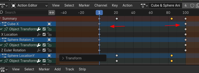 그러면, Action Editor 에 해당 트랙의 Keyframe 들이 보입니다.