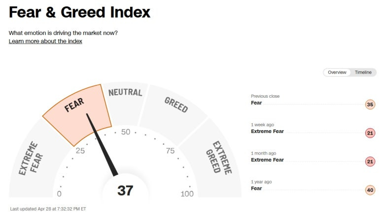 미국 증시 공포 탐욕 지수 (Greed and Fear Index): 37