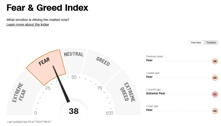 미국 증시 공포 탐욕 지수 (Greed and Fear Index): 38