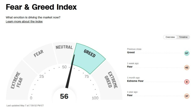 미국 증시 공포 탐욕 지수 (Greed and Fear Index): 56