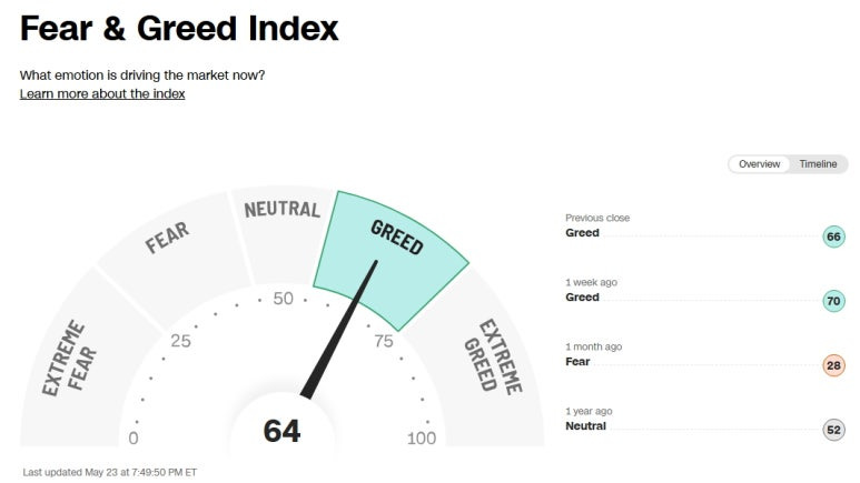 미국 증시 공포 탐욕 지수 (Greed and Fear Index): 64