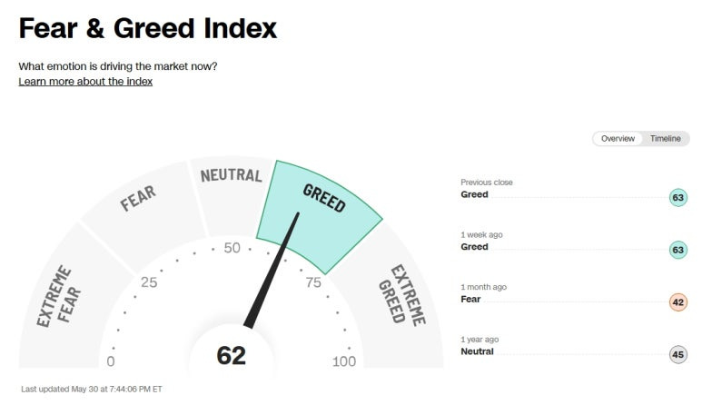 미국 증시 공포 탐욕 지수 (Greed and Fear Index): 62