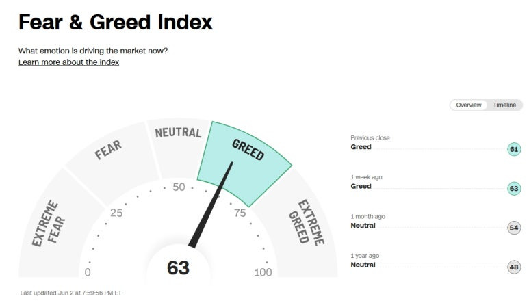 미국 증시 공포 탐욕 지수 (Greed and Fear Index): 63