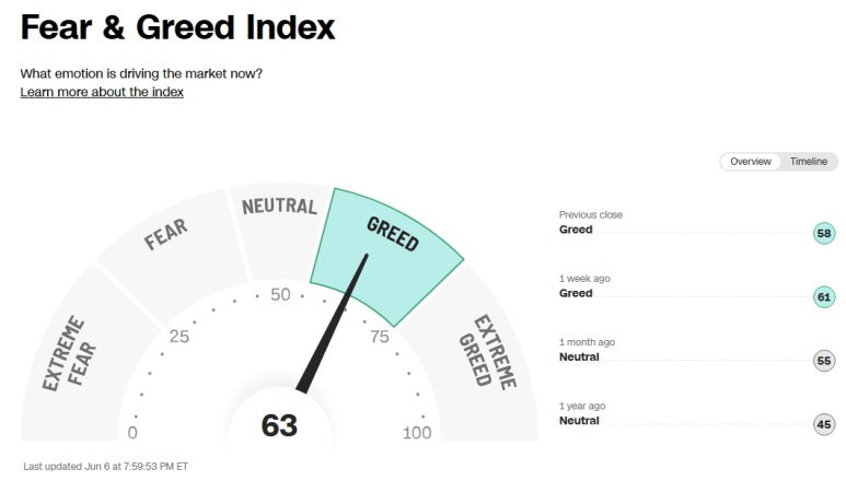 미국 증시 공포 탐욕 지수 (Greed and Fear Index): 63