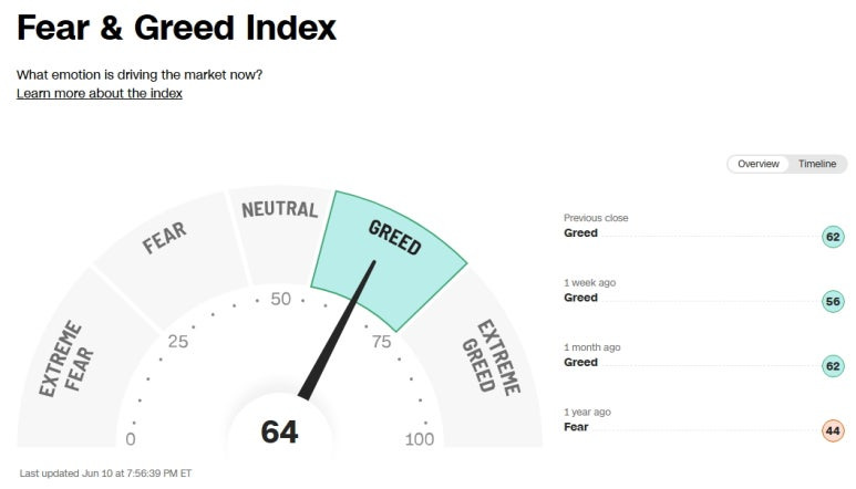 미국 증시 공포 탐욕 지수 (Greed and Fear Index): 64