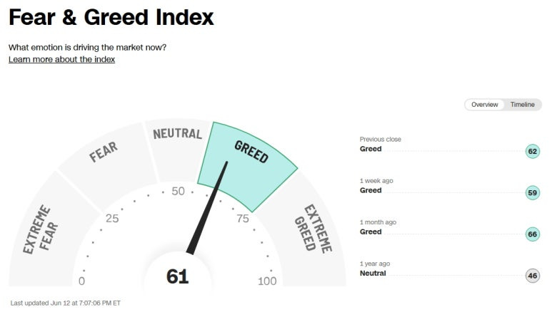 미국 증시 공포 탐욕 지수 (Greed and Fear Index): 61