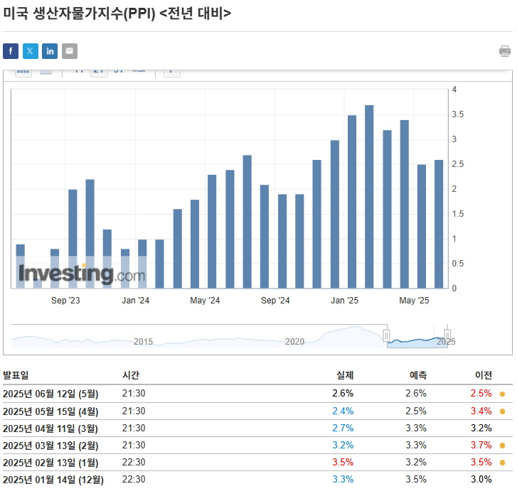 5월 생산자물가 지수 PPI 전월 대비 0.1% 상승해 시장 예상치를 하회.