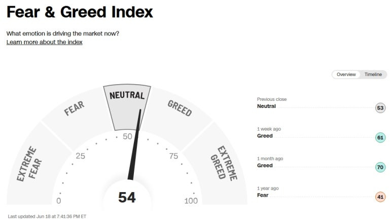미국 증시 공포 탐욕 지수 (Greed and Fear Index): 54
