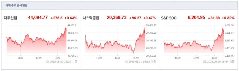 미국이 주요 교역 상대국들과 구체적인 합의에 가까워지고 있다 라는 기대감과 연준이 금리 인하를 재개할 것이라는 전망에 증시가 사상 최고치 상승 마감. (오로지 기대감)