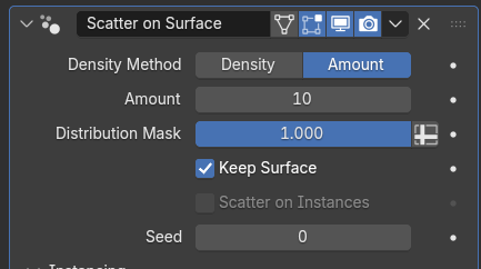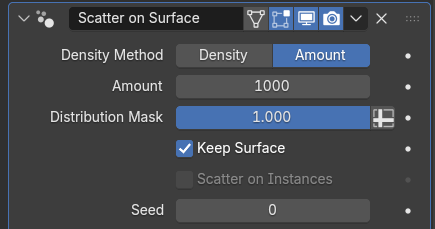 바닥 역할의 메시(Mesh)표면에 점(Points)이나 인스턴스(Instances)를 절차적Procedural 으로 분산Scatter 시키는 데 사용되는 강력한 기능입니다.
