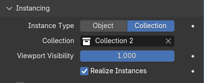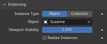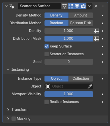 Scatter on Surface 의 옵션들입니다. 우선 중간 즈음에 있는 Instancing에서 Instance Type은 기본 값이 Object 이고, Object 칸에서 선택을 합니다.