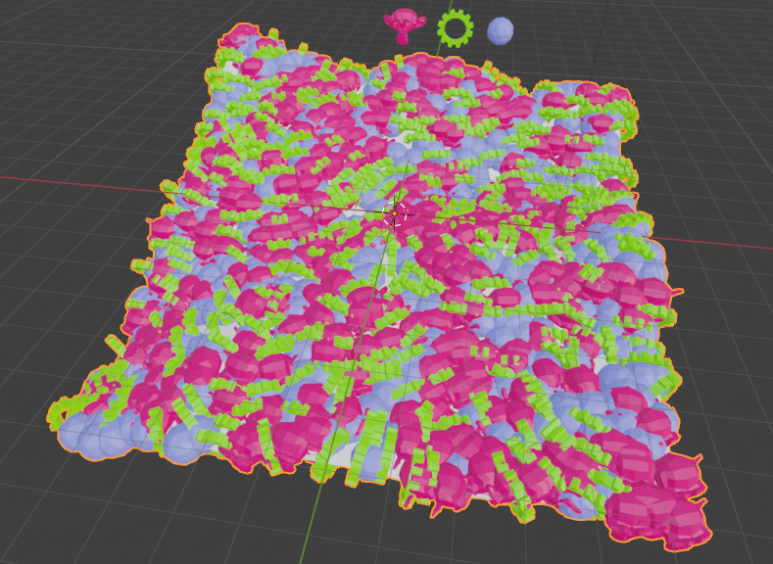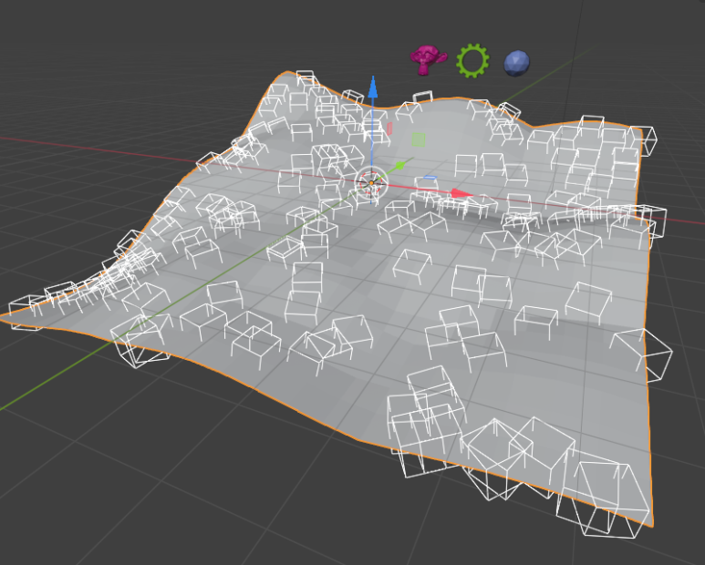 그리면 가상의 큐브 같은 메쉬들이 바닥 표면에 깔리게 됩니다. 저 위치에 선택한 오브젝트의 인스턴싱이 일어나게 됩니다.