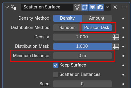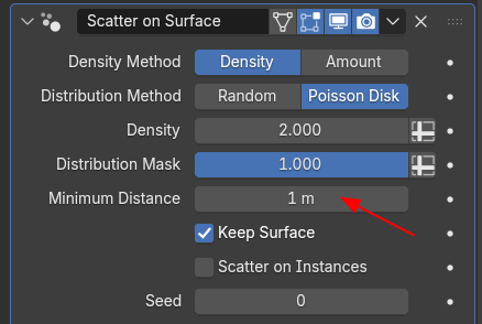 Distribution Method 에 Poisson Disk를 선택합니다. 이것을 선택하면 아래에 Minimum Distance(최소 분리 거리) 옵션이 등장합니다. 이것은 인스턴스간의 거리를 지정해 줄수 있습니다. 기본값은 0 입니다.