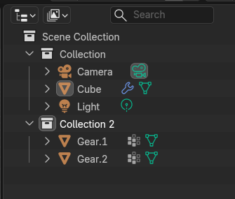 아웃라이너Outliner 에서 확인할 수 있는 Cube와 Gear1,2 입니다.