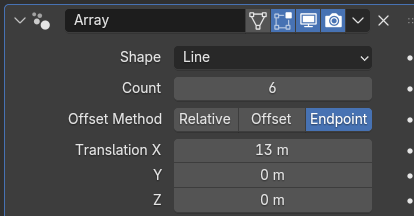 다음은 Endpoint 로 선택합니다. 이것은 Array된 메쉬들의 시작과 끝의 거리를 Translation 에 설정합니다. Count에 6은 그래도 두고 Translation X를 13m로 설정하면, 6개의 메쉬들의 13m 안에 나열됩니다.