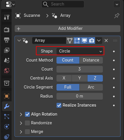 여기까지 Array 모디파이어, Shape Type, 'Circle' 에 대해 알아봤습니다.