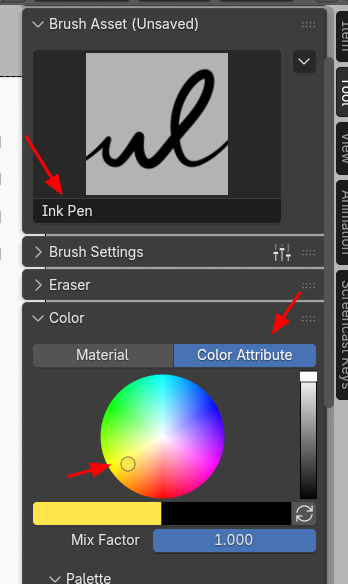 N키로 사이드 바를 열고, Brush를 Ink Pen으로 선택하고, Color를 Material에서 Color Attribute로 선택하고, 색을 지정했습니다.